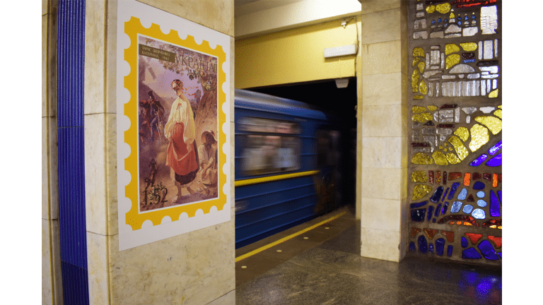 До 100-річчя першої української марки станцію метро «Поштова площа» прикрасили 50 найкращих екземплярів українських поштових марок за історію їх випуску.