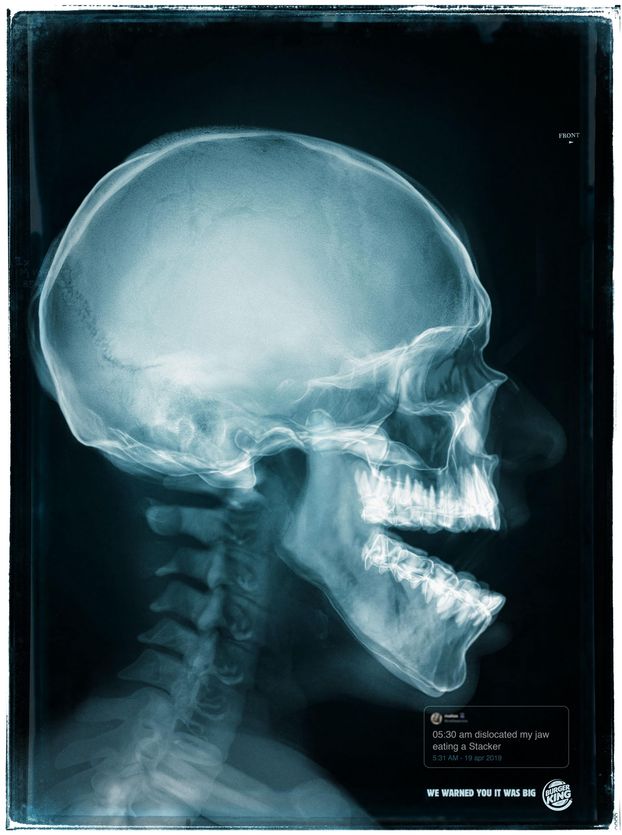 «Ох … вывихнул челюсть в Burger King, отлично, а? Думаю, я единственный человек, который вывихнул челюсть, когда ел воппер». Burger King запускает новую кампанию в печатных СМИ с тэгом «Мы предупреждали вас, что он большой». Своим фирменным насмешливым тоном бренд издевается над преувеличенными размерами своих некоторых сэндвичей, таких как Mega Stacker и Whopper, показывая рентгеновские снимки лиц реальных клиентов, которые испытывали затруднения при употреблении таких больших сэндвичей. Кампания разработана рекламным агентством David, Brazil.
